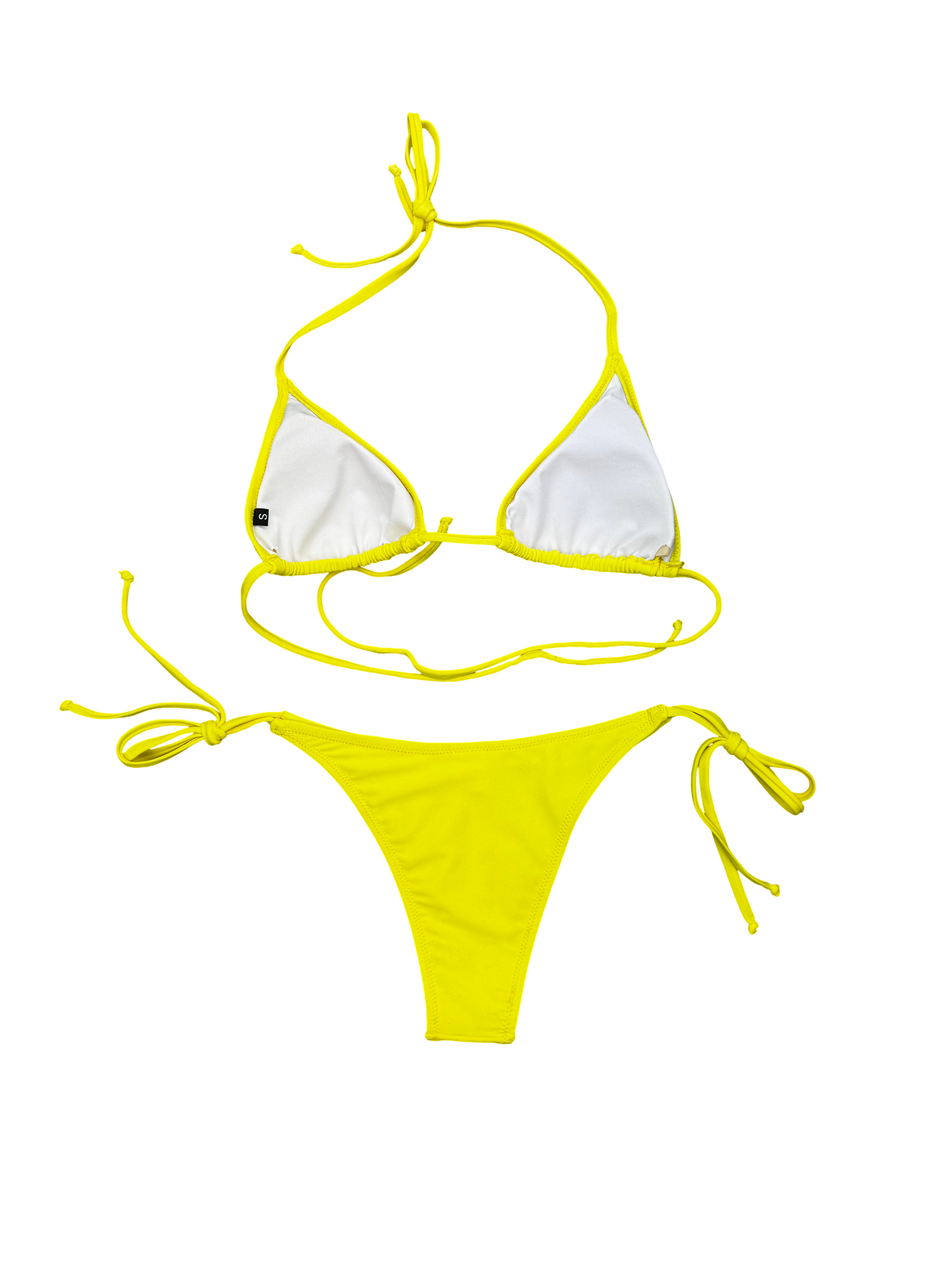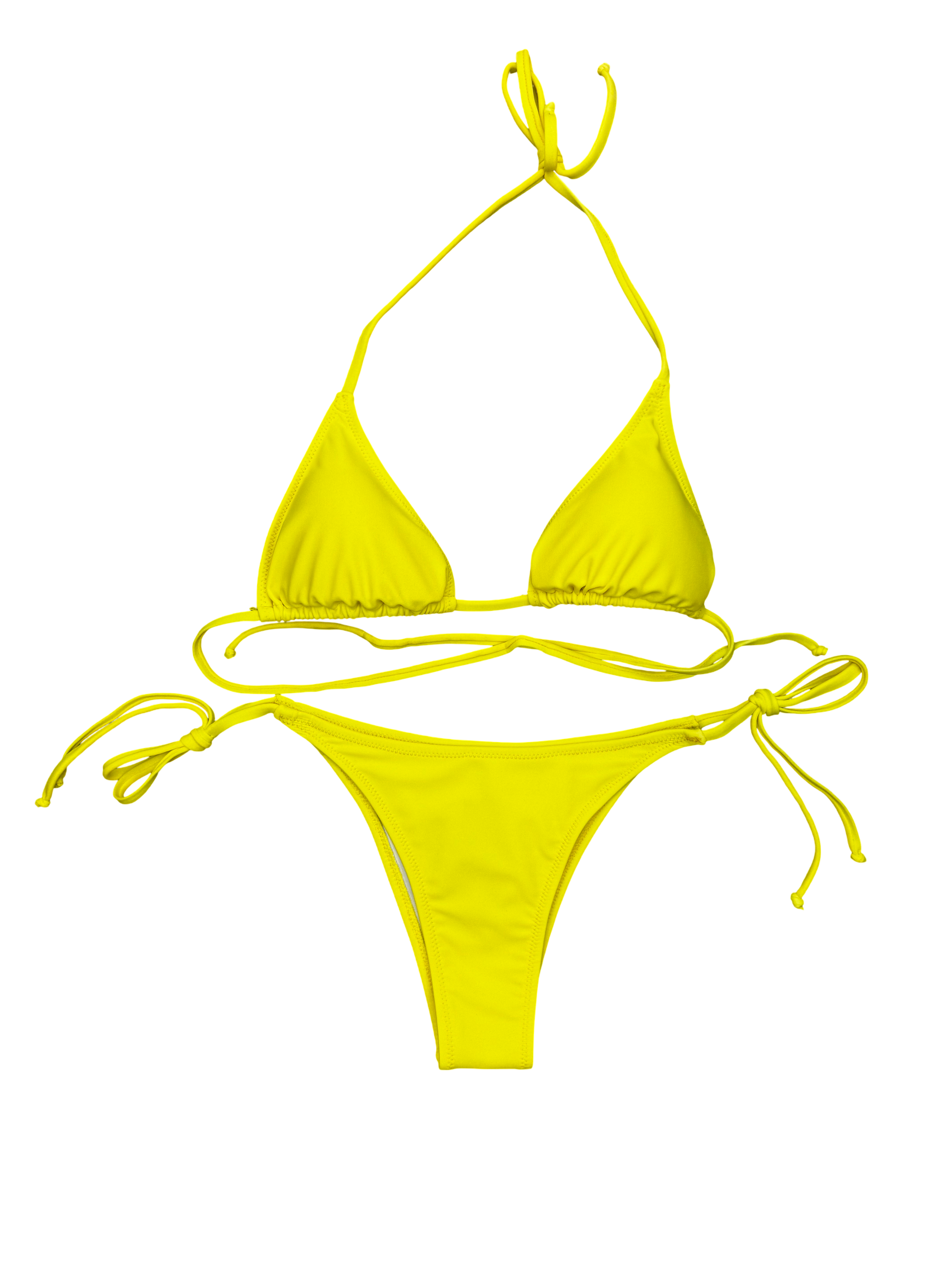 Radiate effortless sunshine in the Golden Hour Bikini in Sunbeam. With its vivid, feel-good yellow hue and timeless triangle cut, this bikini brings a splash of brightness to every beach day. Adjustable ties and a flattering fit make it your go-to for everything from poolside lounging to tropical adventures.