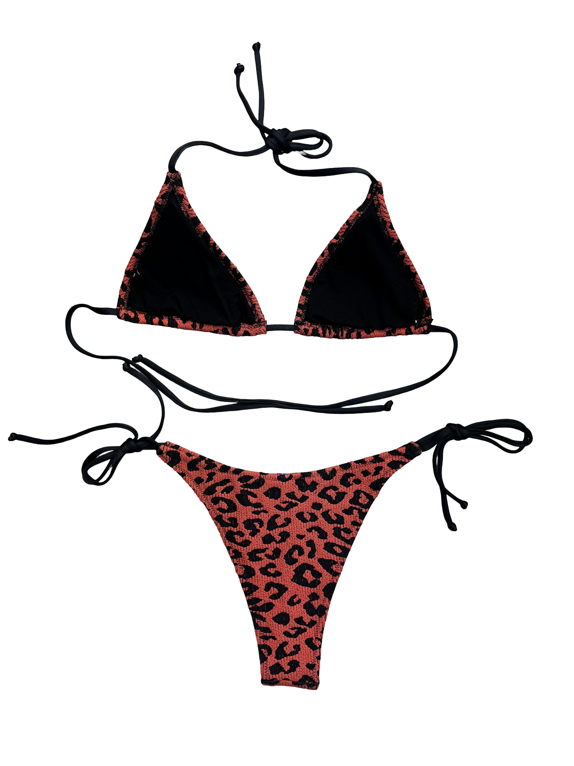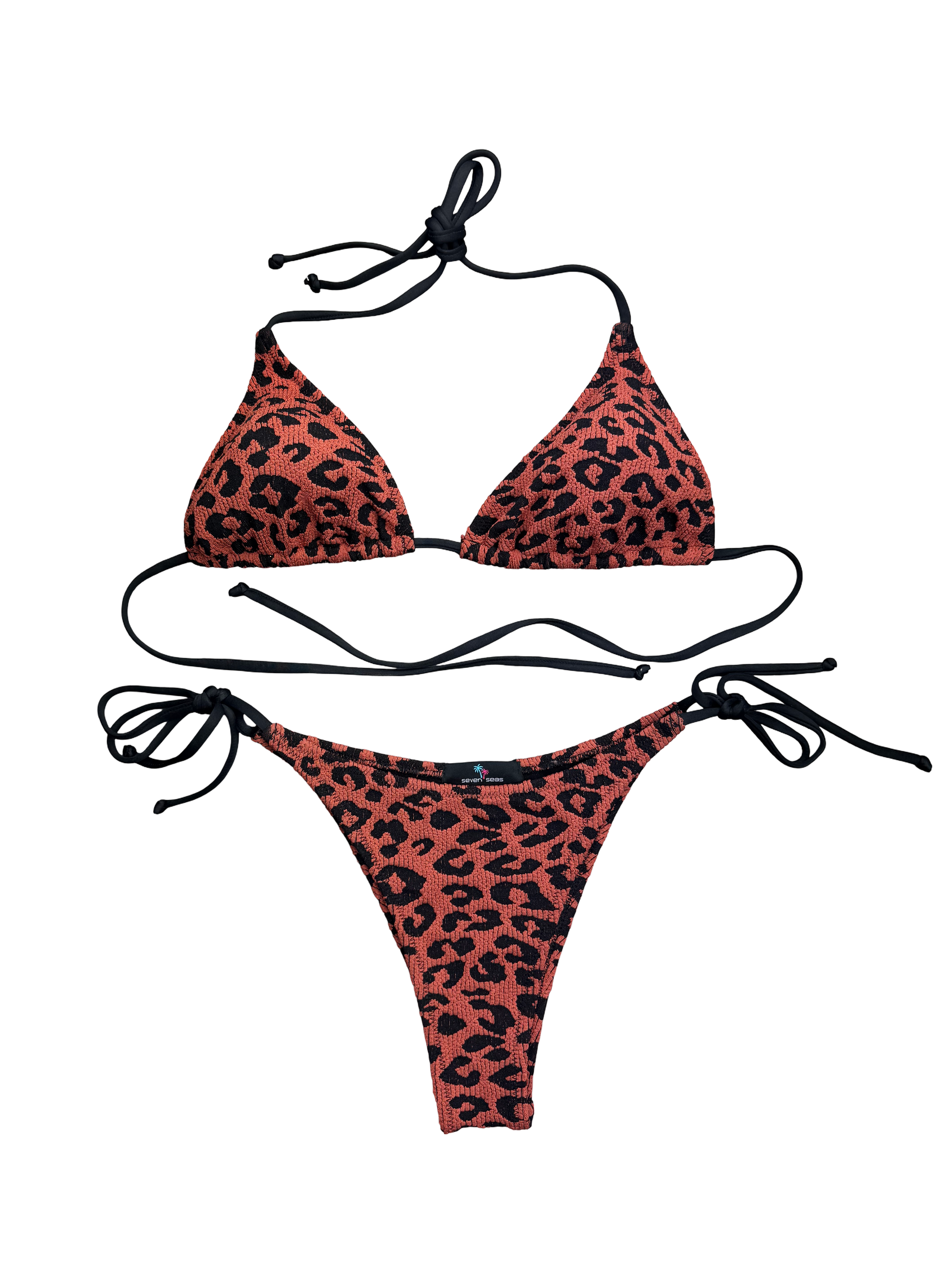 Turn up the heat in the Savage Flame Bikini in Ember Leopard. With a bold burnt orange and black animal print, this stunner is made for those who bring main character energy wherever they go. The textured shimmer fabric adds a luxe edge, while the adjustable triangle top and cheeky tie-side bottoms ensure a flawless fit.